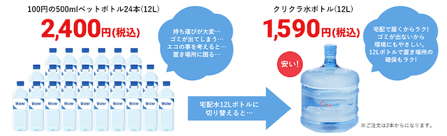 クリクラのお水は、12Lで1本1,590円と他社と比べてかなり安く設定されています。