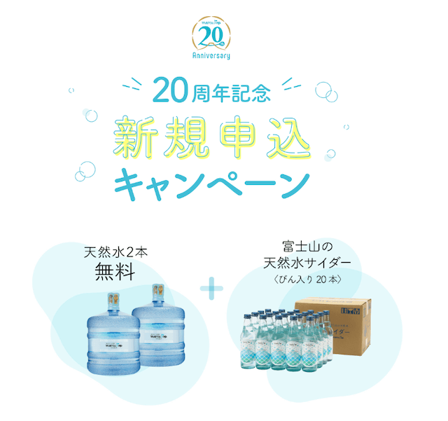 ウォーターサーバー新規申込の方には、『富士山の天然水2本無料』と『設置月のあんしんサポート料無料』、『スペシャルティスマイルコーヒー』を全員にプレゼント!